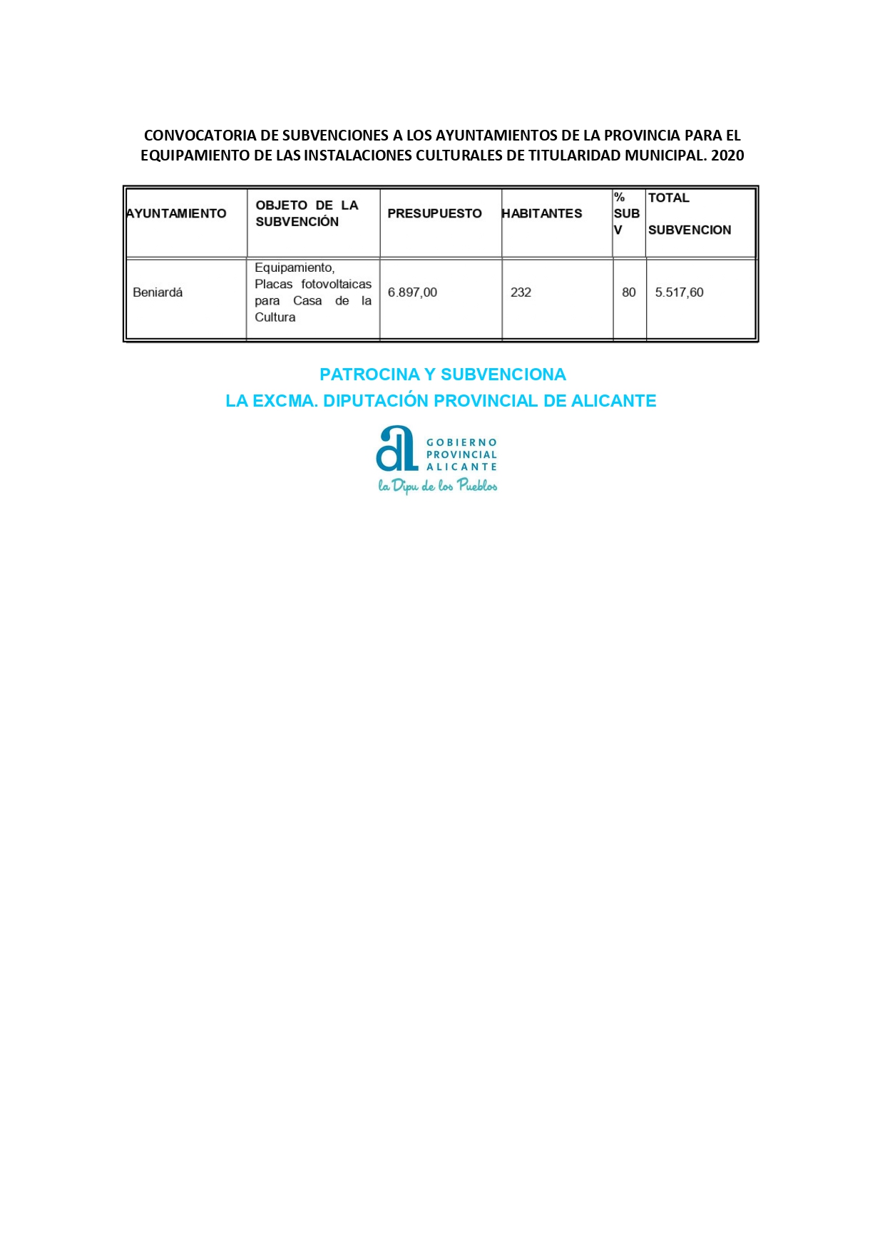 CONVOCATORIA DE SUBVENCIONES A LOS AYUNTAMIENTOS DE LA PROVINCIA PARA EL EQUIPAMIENTO DE LAS INSTALACIONES CULTURALES DE TITULARIDAD MUNICIPAL. 2020